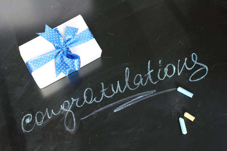 a gift and a congratulation on a holiday written on a blackboard with chalk