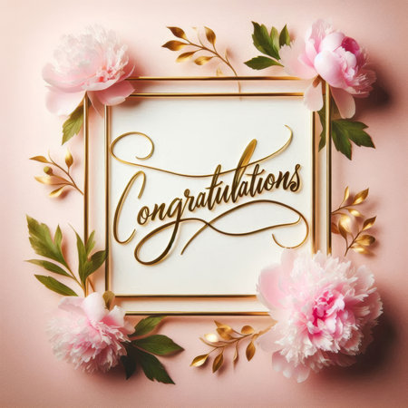 A beautifully designed congratulations card features elegant lettering surrounded by pink peonies and golden foliage, creating a celebratory and refined atmosphere.