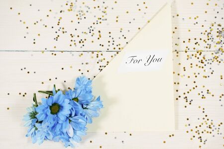 Envelope and self made greeting card concept with fresh carnation flowers.