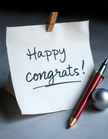 Celebratory note with written message and pen on table