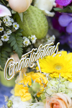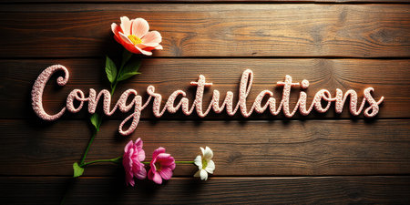 Celebration decorations featuring the word congratulations and floral accents on a wooden surface