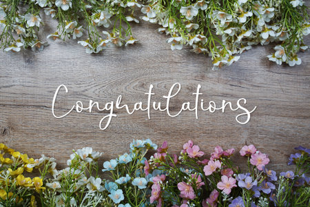Congratulations text message with flowers decoration on wooden background