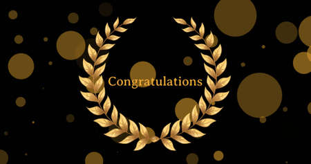 Image of floating golden dots and congratulations in wreath on black background. victory, festivity and celebration concept digitally generated image.
