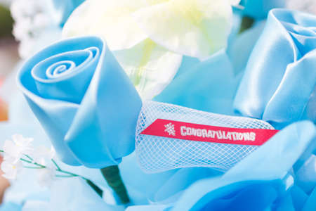 Congratulations text write on paper card with wooden easel and flowers decoration on wooden background