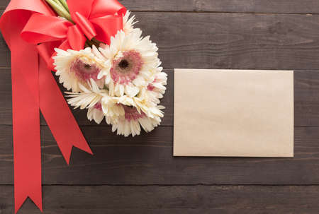 Pink gerbera flowers and card are in the wooden background with ribbon.