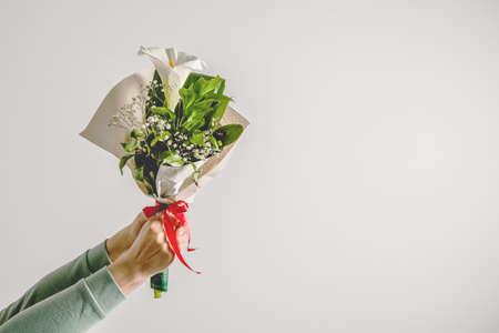 Hands of unknown caucasian woman holding bouquet of decorated Calla Zantedeschia flower in front of white background or wall - congratulations celebration and special occasion concept with copy space