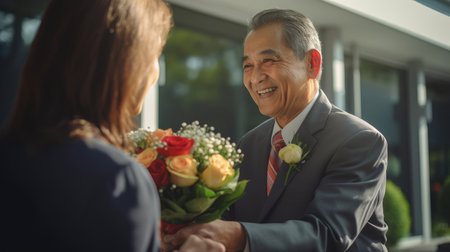 At a prestigious corporate event a senior executive extends a bouquet of flowers to a distinguished client expressing thanks for their enduring partnership and continued support.
