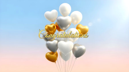A cluster of heart-shaped balloons in white, gold, and silver colors floating against a sky background with the word 'Congratulations' written elegantly.