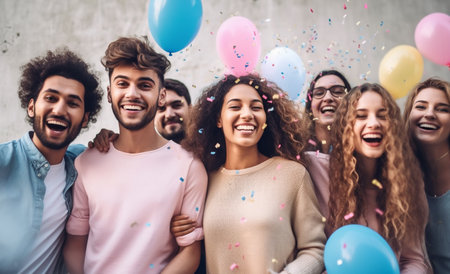 Happy young friends celebrating together during the gender reveal party, over balloons and confetti background. Blue and pink balloons Festive