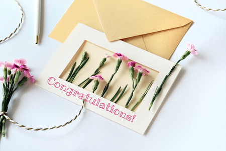 Envelope and self made greeting card concept with fresh carnation flowers.