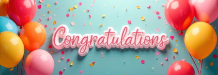 AI Generated. Congratulations banner with colorful balloons and confetti on turquoise background
