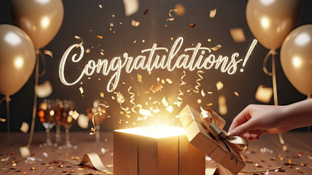 An illuminated gift box is being opened, releasing confetti and light, with the word Congratulations displayed prominently. The image showcases golden balloons in the background, set on a wooden surface. The scene features warm lighting and a festive atmosphere suitable for various celebratory uses.