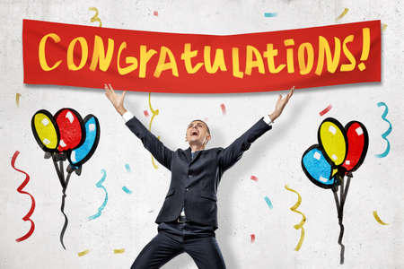 Excited businessman celebrating success with red CONGRATULATIONS sign above and painted colorful balloons