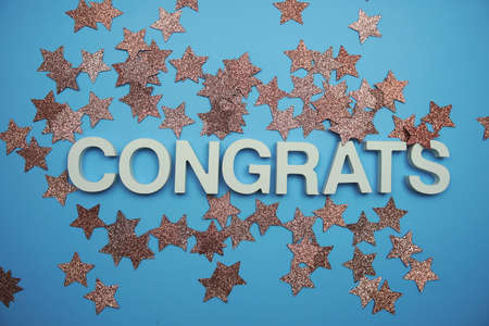 word 'congrats' from magnetic letters and serpentine on blue paper background