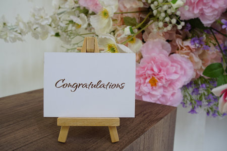 Congratulations text write on paper card with wooden easel and flowers decoration on wooden background
