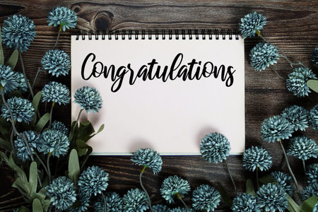 Congratulations text write on paper card with flowers decoration on wooden background
