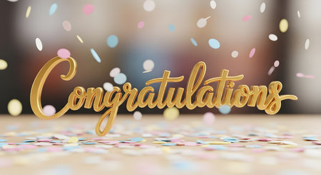 A shimmering golden Congratulations text sits amongst scattered confetti, with more falling from above, creating a festive celebratory atmosphere.
