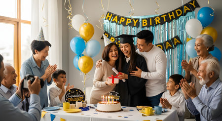 A happy multigenerational family celebrates a young woman's graduation at home with a cake and balloons. The graduate in her cap and gown receives a gift and hug from her mother while grandparents and father applaud joyfully.