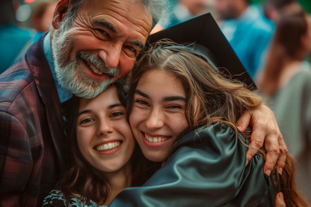 A college graduate in a gown and hat is congratulated by her parents on completing her studies. Celebration of graduation from university