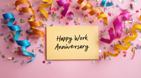 Colorful Celebration Theme with Confetti and Streamers for Happy Work Anniversary Card on Pink Background