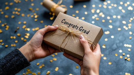 A person is holding a brown box with the words Congratulations Grad written on it. The box is tied with a gold ribbon