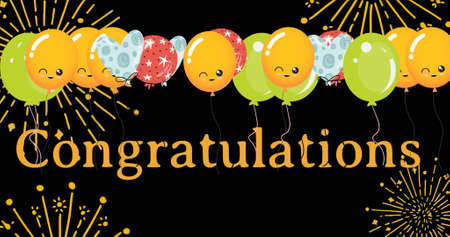 Image of congratulations text over balloons and fireworks on black background. party and celebration concept digitally generated image.