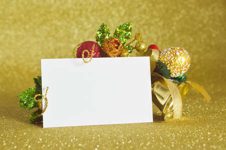 Blank christmas card with christmas ornament on gold background