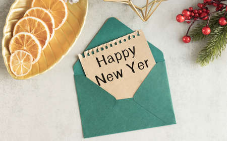Christmas greeting card with envelope on wooden white background with fir tree branches and happy new year decorations. Top view copyspace