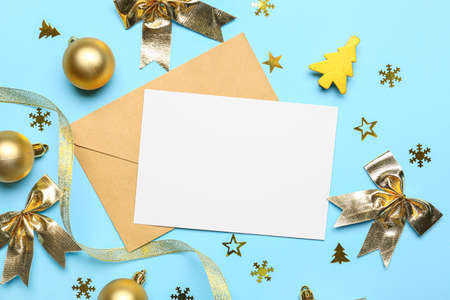 Beautiful Christmas composition with blank card and envelope on color background