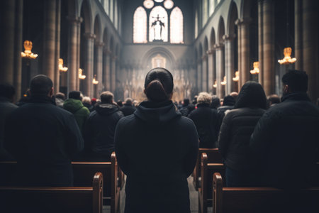 A congregation of people stands in wooden pews during a church service, viewed from behind. Dressed in respectful attire, they are engaged in prayer, some with hands clasped or raised. The background shows the classic architecture of a church with stained glass windows, creating a serene and spiritual atmosphere.