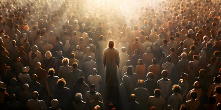Jesus standing amidst a large gathering of diverse individuals. Concept Religious Unity, Spiritual Gathering, Jesus and Diversity, Inclusive Faith, Multicultural Worship