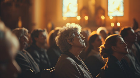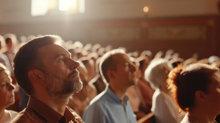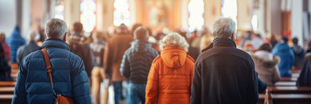 people, crowd, church, worship, community, gathering A diverse group of individuals attending a service inside a church, facing the altar, with warm, inviting light filling the space, creating an a