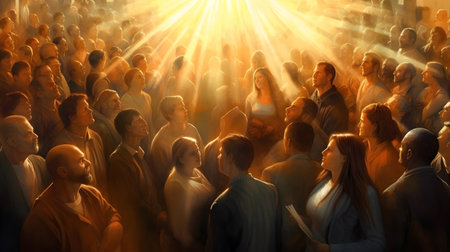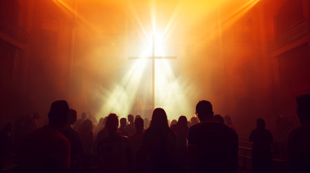 A congregation of people is silhouetted against a bright, central light source, raising their hands toward a cross. The scene is illuminated by an overhead spotlight, creating a dramatic, ethereal atmosphere. The image showcases textures, contrasts, and a composition ideal for promotional content or editorial use in various media.