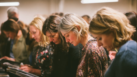Christian parishioners sit quietly in wooden pews, hands clasped and heads bowed, participating in a peaceful worship ceremony.
