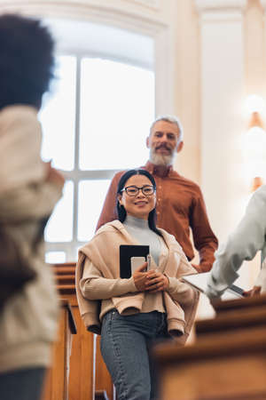 Low angle view of smiling asian student with smartphone and notebook looking at camera near blurred friends and teacher in university
