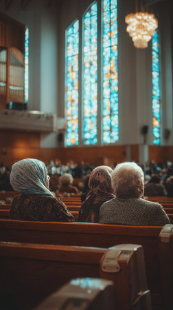 Elderly individuals sit quietly in wooden benches during a ceremonial gathering in a church filled with colorful stained glass windows, creating a serene atmosphere.