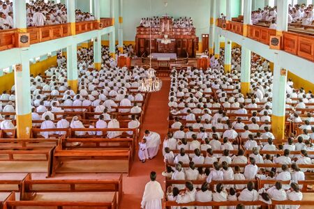 Soatanana, Madagascar, March 05, 2013: Church of the white shepherds of Soatanana. They are a fundamentalist branch of Protestantism very specific in Madagascar. All the inhabitants are dressed in white.