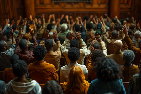 Image captures diverse individuals enthusiastically raising their hands in unison within a wooden interior, exemplifying a collective display of unity, participation, and engagement in an indoor event