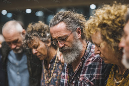 A multicultural group of men and women stand in a circle, holding hands with heads bowed in a moment of collective prayer and spiritual unity.
