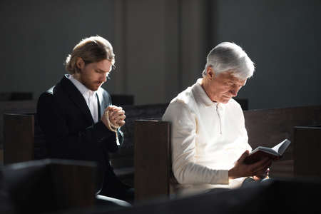 Men sitting on the bench and praying in the church during mass