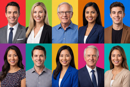 A grid of ten diverse smiling business professionals including men and women of different ages and ethnicities posing against vibrant solid colored backgrounds.