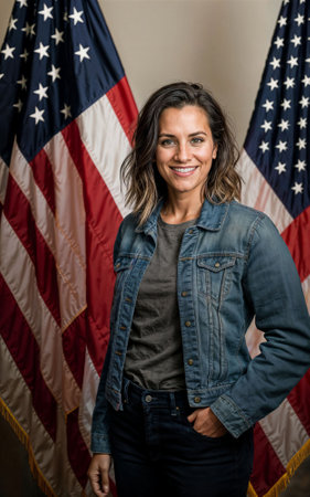 Confident Business Professional Posing with Arms Crossed, American Flag, and Cityscape View