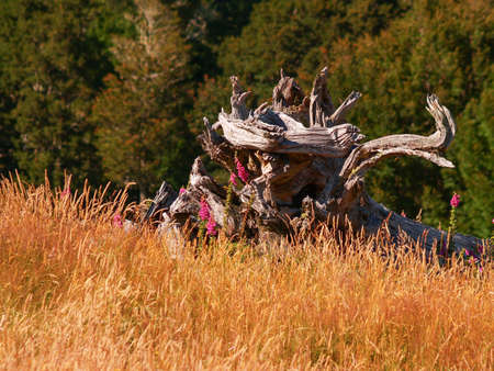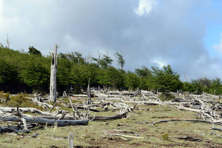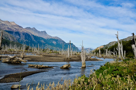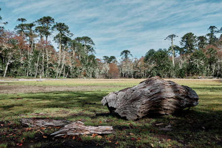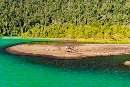 Lake El Escorial and petrified Forest by the action of volcanic lava. Nalcas National Reserve, National Park. Chilean Patagonia, Chile.