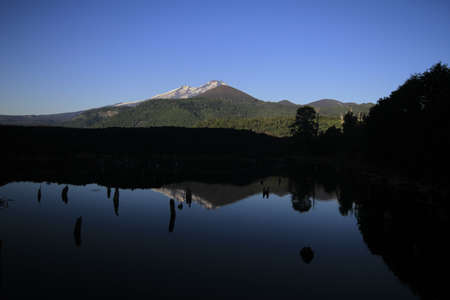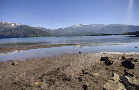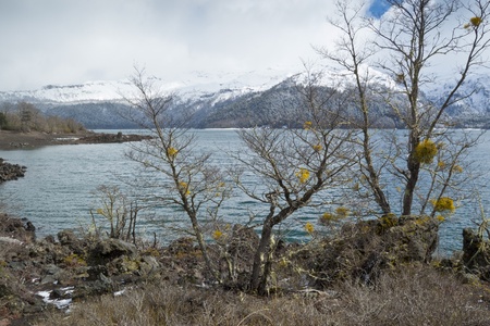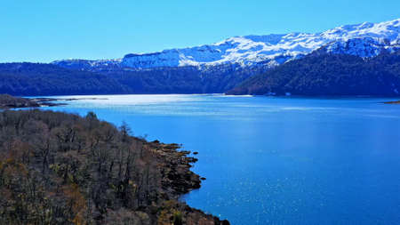 coast of the lake and snow covered mountains in national park of Conguillio in Chile