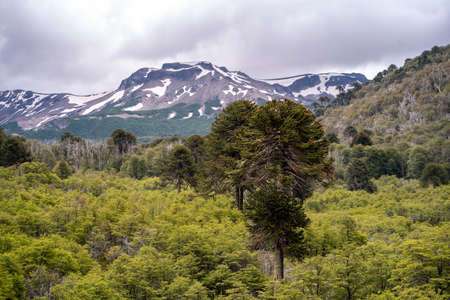 Araucaria with vegetation and mountain with snow on a cloudy day, Chile