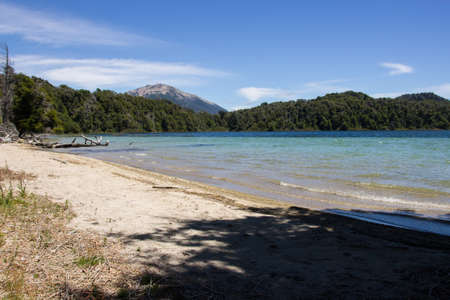 Landscape of lake Lacar, San martin de los Andes, Neuquen, Argentina. Taken on a warm summer afternoon under a ble sky with a few white clouds