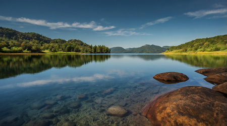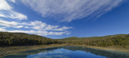 Scenic landscape on a sunny day on the lake with the reflection of trees, sky and clouds in the water. Small artificial lake in Montioni Natural Park, Tuscany Italy