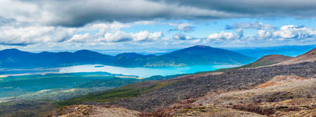 Panoramic photo of Lake Rotoaira seen from volcanic slope of Mt. Tongariro on Tongariro Crossing national park. North Island, New Zealand
