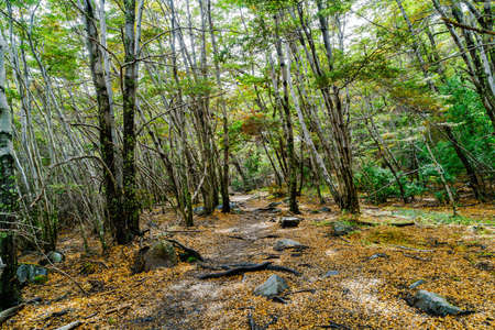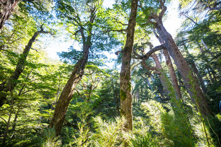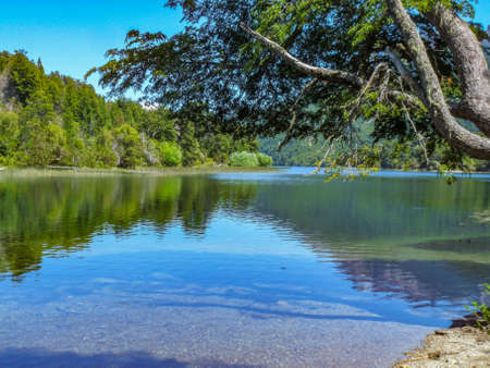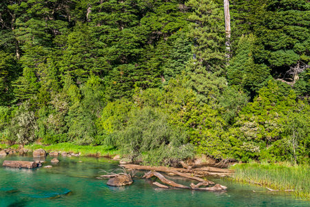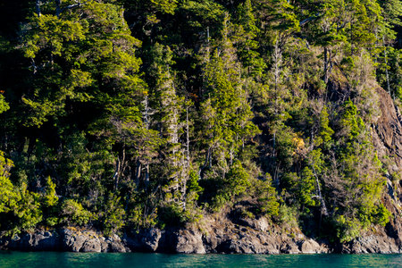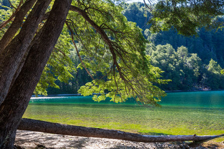 Summer day forest landscape scene at border of lake, los alerces national park, a world heritage site located in chubut province, patagonia, argentina