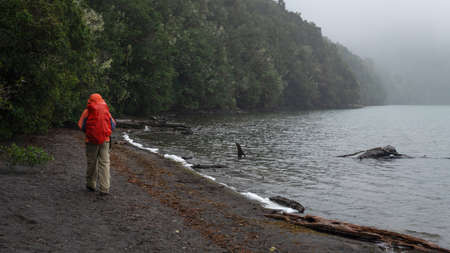 Man in hike in volcanoes region (Araucania) in Chile, South America